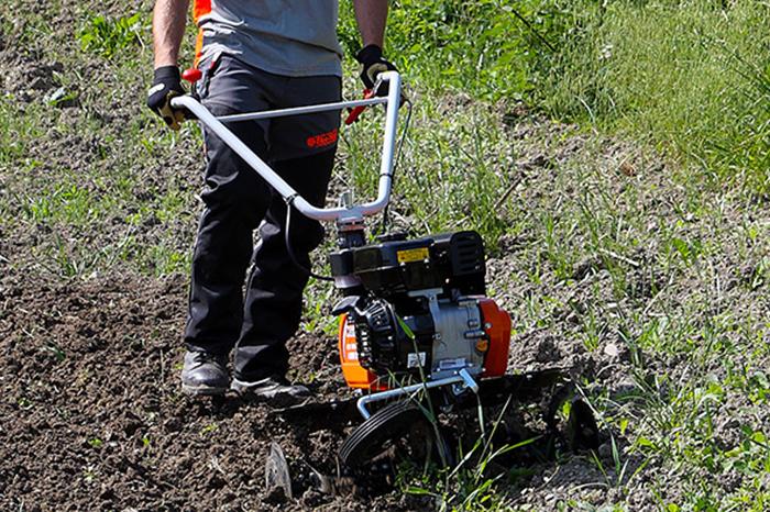 You can find both petrol-driven and electrical rotary tillers on the market. The type of power source determines the power output: generally speaking, petrol-engine rotary tillers are the most powerful. The power output of a rotary tiller determines the scale and intensity of the tasks you can perform with it.