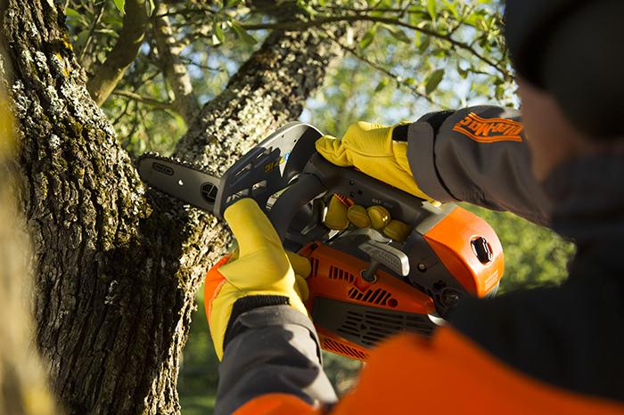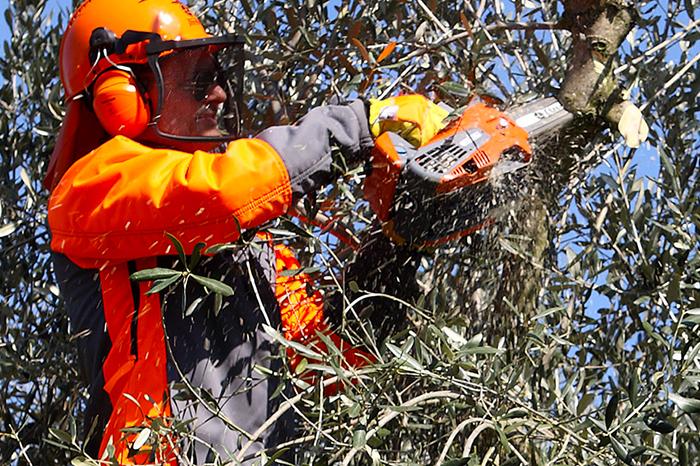 You can also work with power tools such as a pruning chainsaw or, for pruning at height with maximum practicality, pruners. To cut bigger branches you can opt for a petrol engine pruning chainsaw like the Oleo-Mac GST 250, with 1 kW rated power, compact dimensions, low weight (2.7 kg) and a 25 cm solid professional guide bar tipped with Stellite®, a highly wear-resistant alloy.